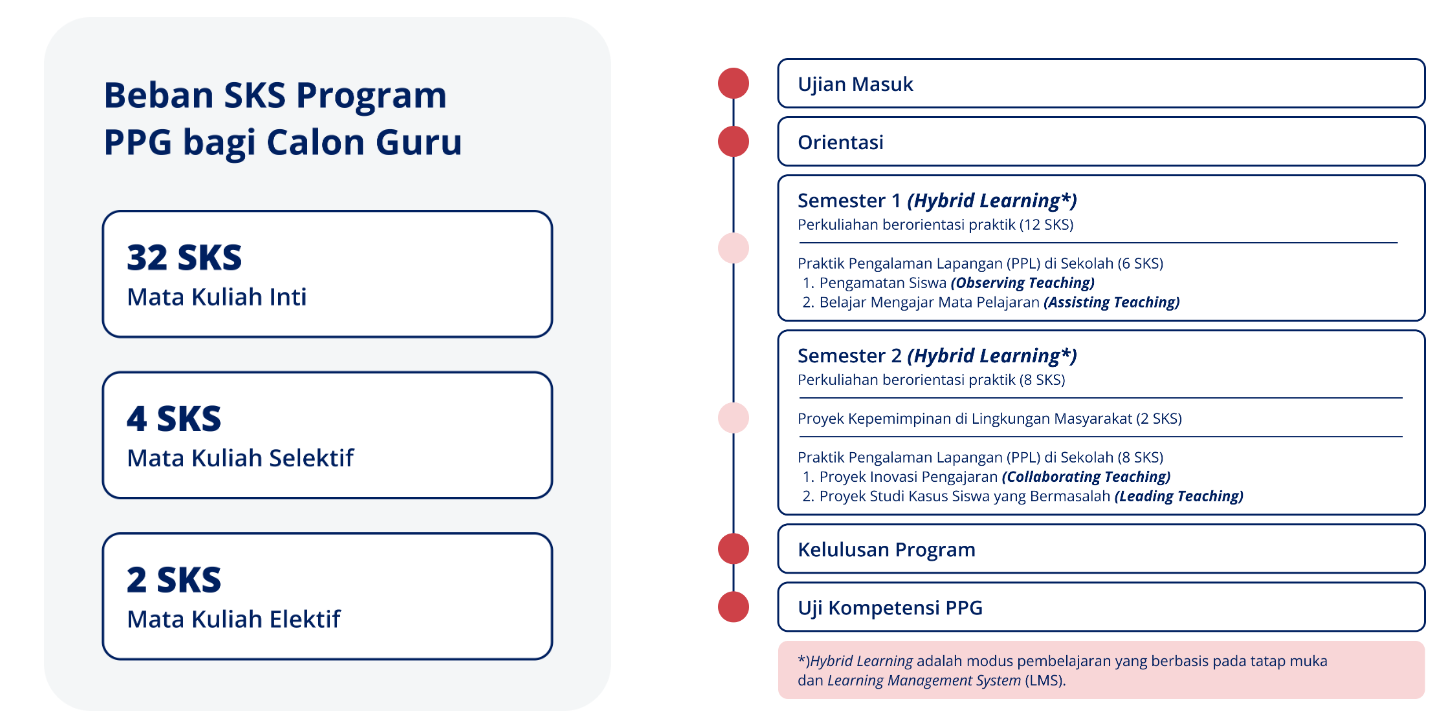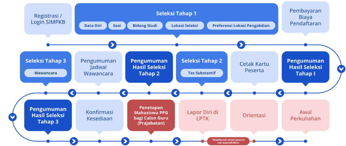 Perjalanan mengikuti PPG bagi Calon Guru dimulai dengan tahap seleksi dan mengikuti rangkaian Program Pendidikan Profesi Guru selama dua semester yang terdiri dari perkuliahan, praktik kerja lapangan, proyek kepemimpinan, dan pendampingan.